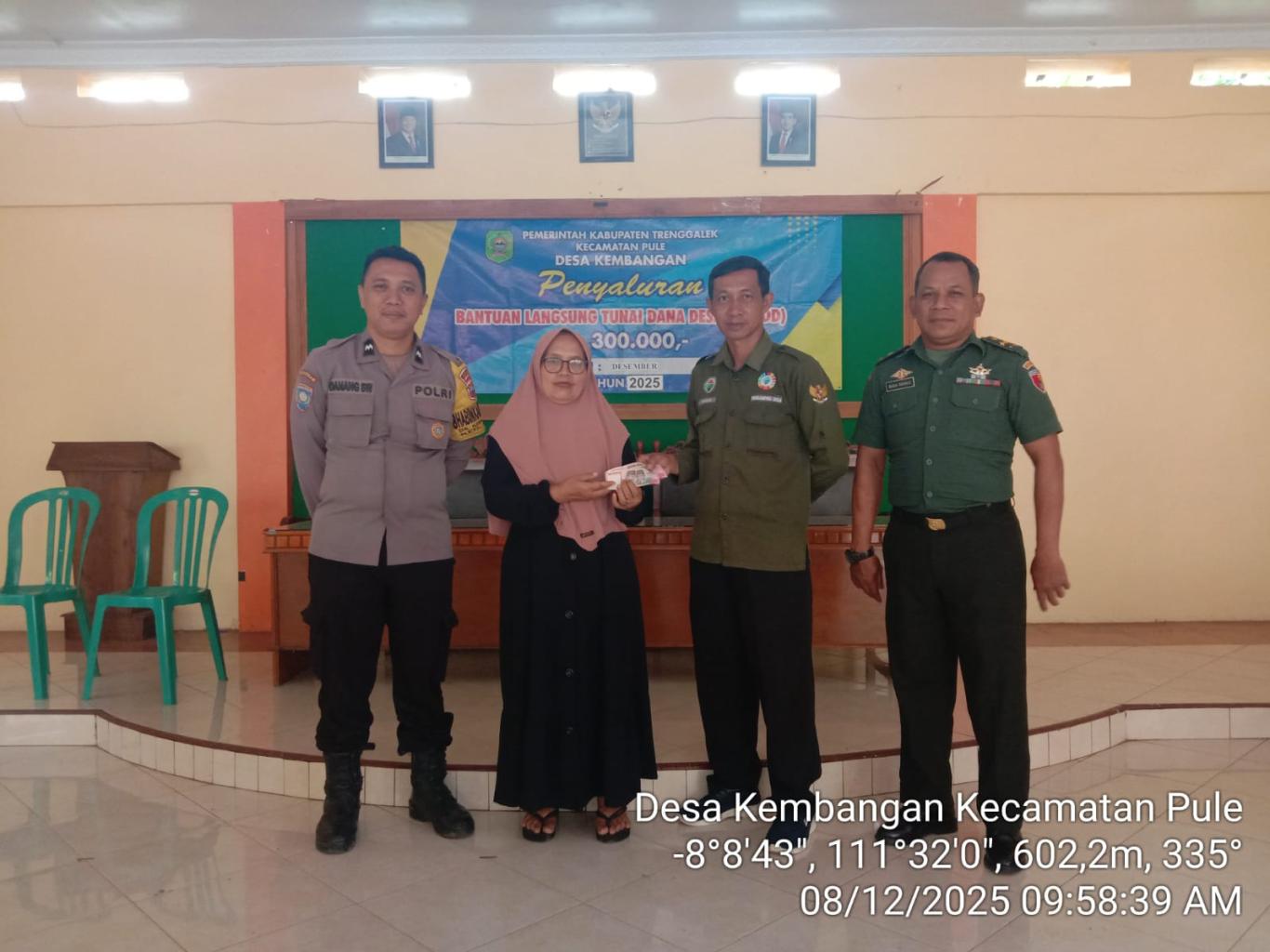 Giat hari ini senin tanggal delapan bulan desember tahun dua ribu dua puluh lima telah di lakukan penyaluran BLT DD sebanyak 20 KPM, masing - masing KPM mendaptakan Rp. 300.000. Kegiatan tersebut dihadiri oleh Babinsa, BKTM, Pendamping Desa, ddan Kepala Desa.